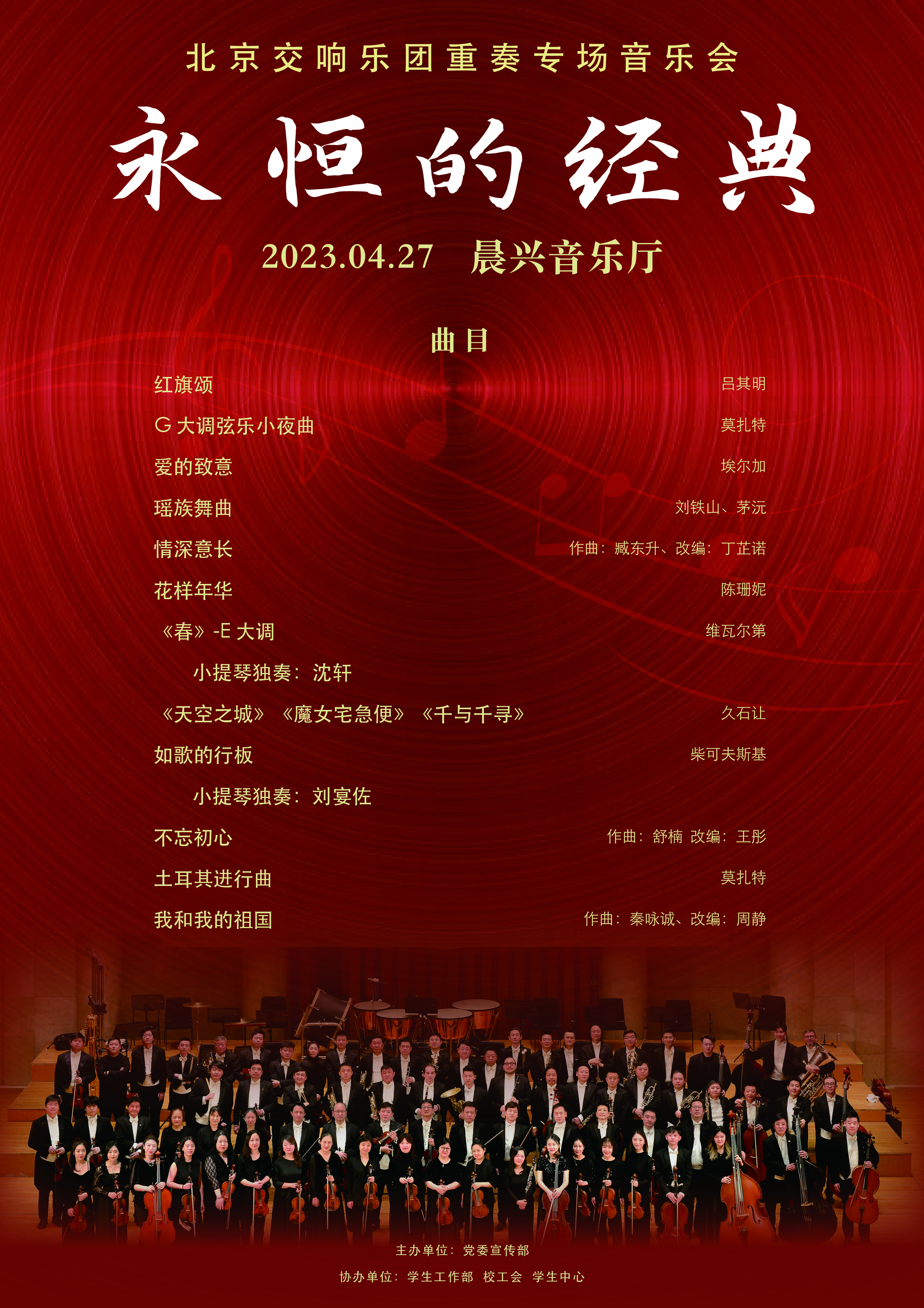 “永恒的经典”——北京交响乐团重奏专场音乐会将于周四(4月27日)19:30,周五(4月28日)19:30先后在学院路校区晨兴音乐厅、沙河校区咏曼剧场上演。