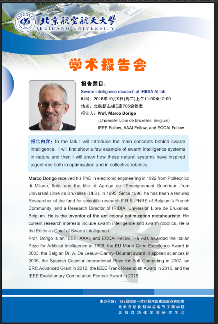 报告人:Prof.Marco Dorigo (Universite'Libre de Bruxelles, Belgium)IEEE Fellow,AAAI Fellow, andECCAIFellow