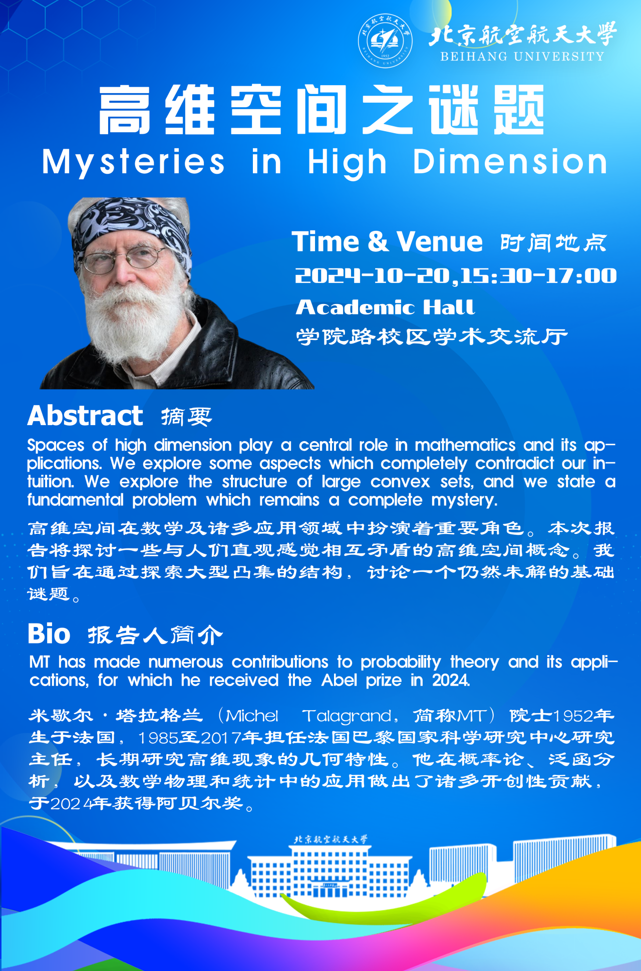 米歇尔·塔拉格兰(Michel Talagrand,简称MT)院士1952年生于法国,1985-2017担任法国巴黎国家科学研究中心的研究主任,长期研究高维现象的几何特性。他在概率论、泛函分析,以及数学物理和统计中的应用做出了诸多开创性贡献,于2024年获得阿贝尔奖。
