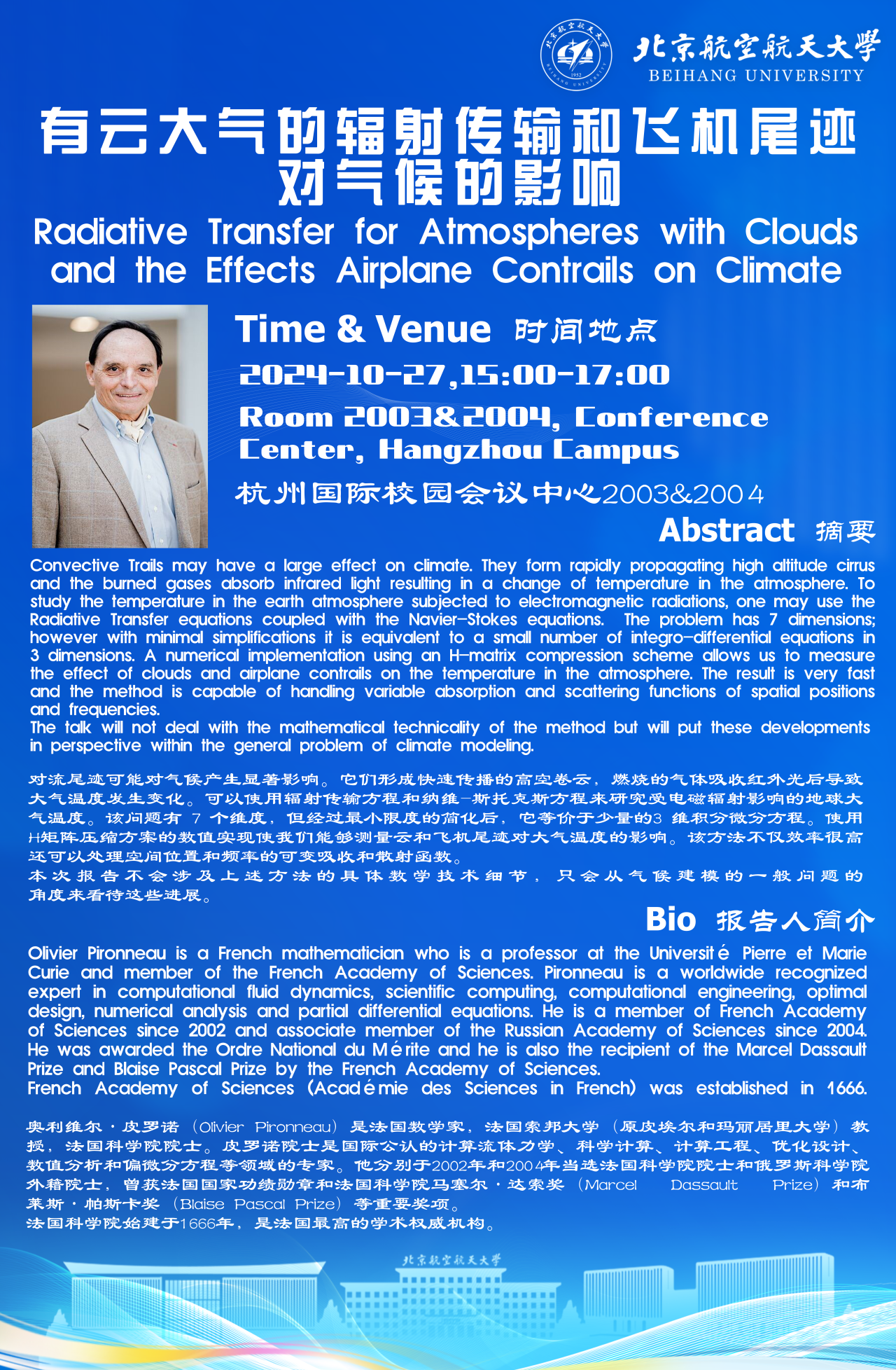 奥利维尔·皮罗诺(Olivier Pironneau)是法国数学家,法国索邦大学(原皮埃尔和玛丽居里大学)教授,法国科学院院士。皮罗诺院士是国际公认的计算流体力学、科学计算、计算工程、优化设计、数值分析和偏微分方程等领域的专家。他分别于2002年和2004年当选法国科学院院士和俄罗斯科学院外籍院士,曾获法国国家功绩勋章和法国科学院马塞尔·达索奖(Marcel Dassault Prize)和布莱斯·帕斯卡奖(Blaise Pascal Prize)等重要奖项。