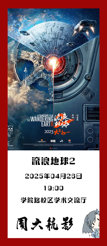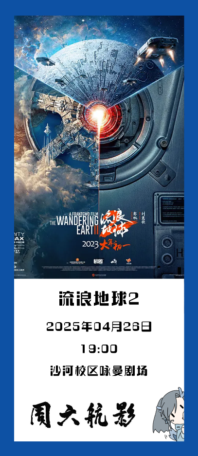 4月26日(周六)19:00 学院路校区学术交流厅,沙河校区咏曼剧场,杭州校区音乐厅,《流浪地球2》同步放映!(无需预约,凭校园卡/校友卡即可入场观影)