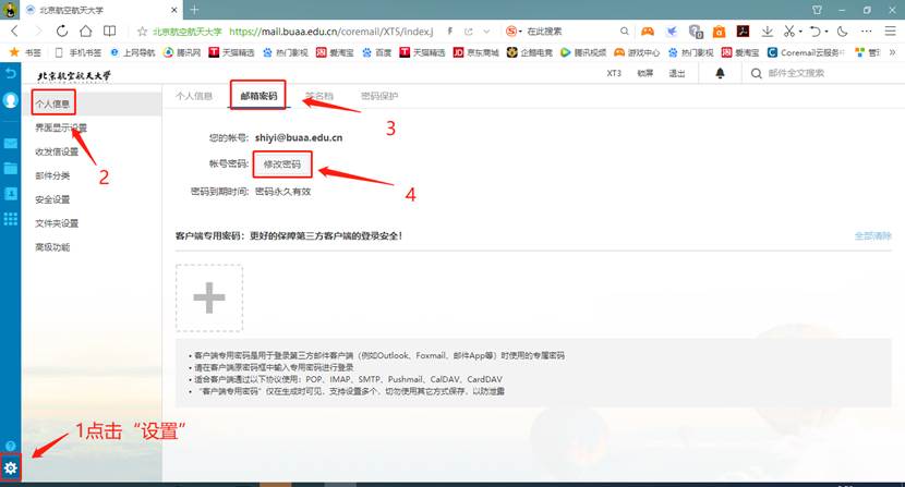 3.定期修改邮件系统和统一认证系统的密码为强密码,强密码应为8位以上的无规律密码,同时包含大小写字母+数字+字符,如:xyl37@bUaa@。
