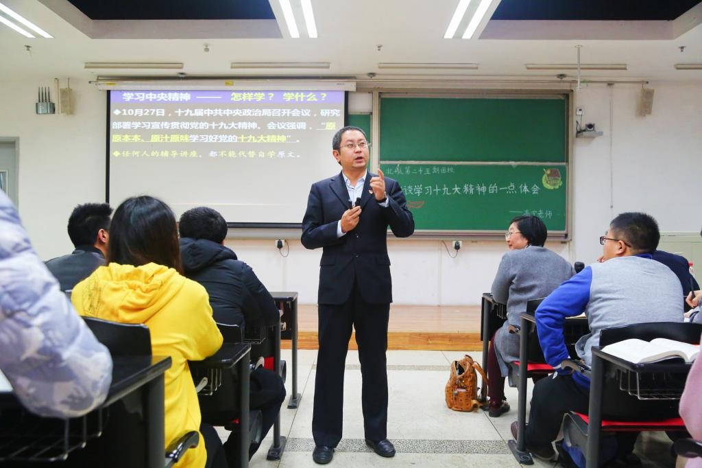 高宁老师不仅是一位优秀的思政课教师,还是一名杰出的共产党党员。除了本职的思政课外,他将讲授党课看作自己应尽的义务与责任,并积极解答大学生党员的思想困惑,助力他们成长成才。为了贯彻学校学生党校团校的“小班化”教学方针,除了每年320个学时的教学任务之外,他还每月去校团校党校授课2-3次,学校近乎所有的入党积极分子和学生党员都听过高宁老师的党课,他每请必到,特别是党的十九大以来,他每年在校内宣讲超过70次。在士谔书院,高宁老师担任了书院思政总导师,与彭付芝教授一起,为士谔书院士信党建工作坊《大国领袖》课程付出了很多的心血。经过两年四轮党建工作坊《大国领袖》课程的授课,许多士谔书院的学子在高宁等老师们的引导下,决心加入中国共产党,树立了为共产主义奋斗终身的理想信念。