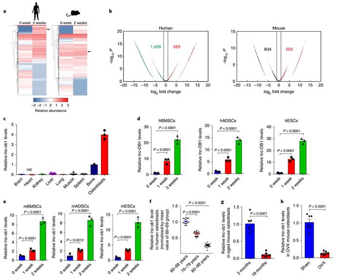 研究的关键——发现lnc-Ob1是一个艰难曲折的过程。团队希望找到成骨细胞特异性的靶点分子,从根本上增加骨量对抗骨质疏松。为此,团队使用小鼠和人的BMSCs(bone marrow stem cells,骨髓间充质干细胞)分化模型,利用链特异性建库技术对分化前后的细胞进行转录本超高深度测序,获得了600余G的原始数据(相当于一般测试的200倍数据量),然后利用团队自主研发的FANSe3算法进行分析。通过对这些差异表达的lncRNA基因在序列相似性、时序表达、基因组织等多方面进行的系统评估,课题组鉴定到一个人和小鼠成骨细胞中都特异性上调的lncRNA分子(命名为lnc-Ob1/lnc-OB1)。进一步研究表明,在老年人成骨细胞中lnc-OB1的表达发生增龄性下调;去卵巢和老年小鼠成骨细胞中lnc-Ob1的表达也发生显著下调。如上结果提示lnc-Ob1很可能与骨形成有密切关系,并且在骨质疏松发生发展过程中有重要的调控作用,这将为治疗骨质疏松提供一种潜在的新方案。