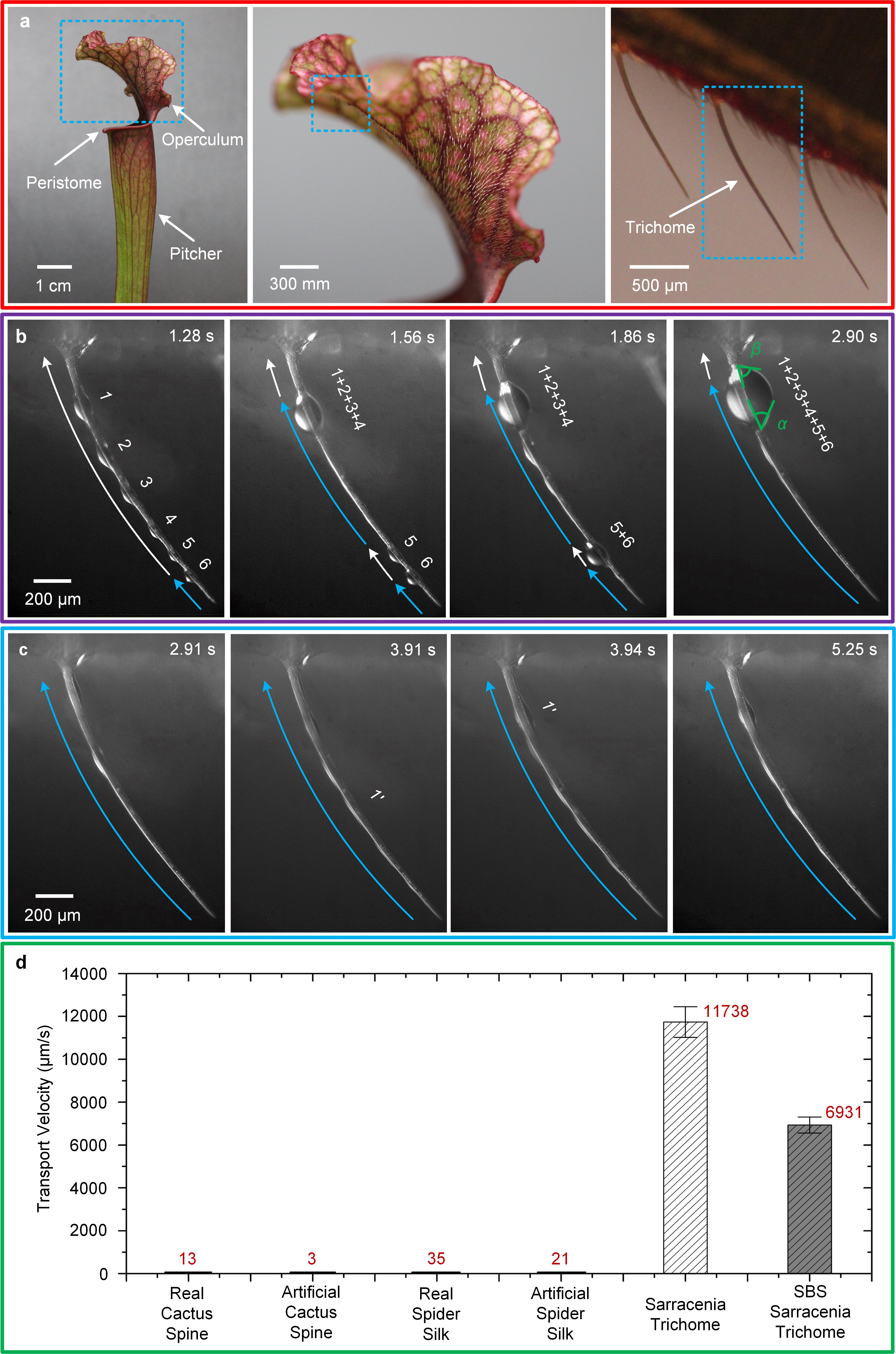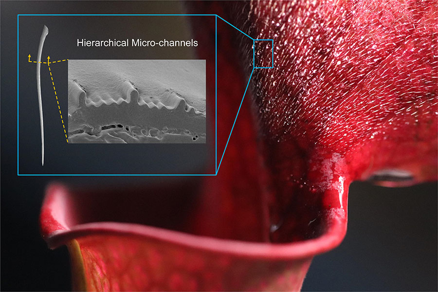 在对瓶子草表面微结构的观察基础上,团队深入分析了绒毛的表面微观结构特征,首次发现了特殊的高低棱多级微纳沟槽结构,液体也在表面干湿状态下会相继出现两种不同的输送模式。这种特殊高低棱多级沟槽结构导致的两种连续而又不一样的输水模式会首先在矮棱构成的底部沟槽中快速形成一薄层水膜,后续液滴就可在这层水膜上超快速滑动,输送模式在干、湿状态下会发生明显转变。用陈教授的话来说,“有一种‘后浪推前浪’的效果”。