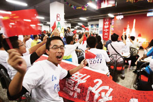 2011年9月29日晚,贝博沙河校区学子在食堂观看天宫一号发射升空直播